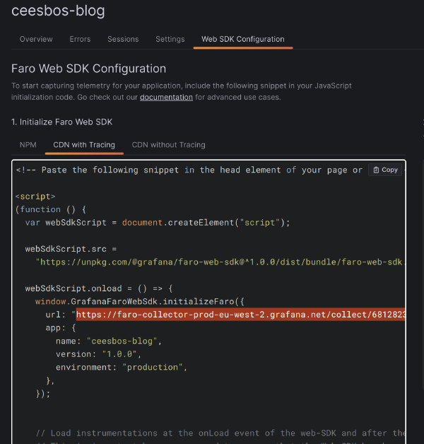 In Grafana Cloud you can add a frontend application and give it a name.