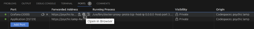 After the ports are configured, you can see that in Codespaces and you can open it is in the browser: